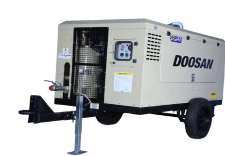The Doosan Portable Power compressor model HP550 is a compactly designed reliable and rugged solution for demanding applications like mechanized quarrying with pneumatic drills, LD4 in granite mining, abrasive blasting, rock anchoring to name a few. The compressor is powered by a Ashok Leyland H6DTi 170 HP reliable engine & is designed for operating between 5 and 52 deg C ambient with a cool box design. Inbuilt pre cleaners are a standard feature & ensure that compressor can operate in high dust environment Copiously sized 180 Litres fuel tank for ensures continuous operation and extra size service valves ensure steady air flow to application point. Separate Good ground clearances ensure that compressor can be towed in rugged terrain with extra thick draw bars & levelling jacks. Easy access to service points and maintenance free batteries are other hallmarks of this compressor. The compressor can also be used with a dual regulation kit available as option for some applications which require a lower drilling pressure. Skid version option also available in this model.